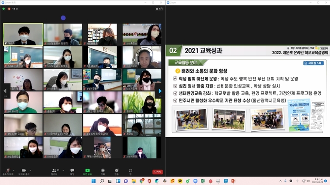 개운초등학교(교장 이강형)는 23일 교육공동체의 학교교육에 대한 참여와 이해를 높이기 위해 학교교육설명회를 개최했다. 학교교육설명회는 코로나19 확산 예방을 위해 실시간 쌍방향 화상 시스템을 활용해 온라인으로 진행했다.