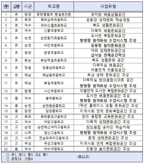 전남교육청은 지난 1월부터 공모를 통해 서류심사와 면접심사를 거쳐 22개 학교를 사업 대상으로 최종 선정했다.