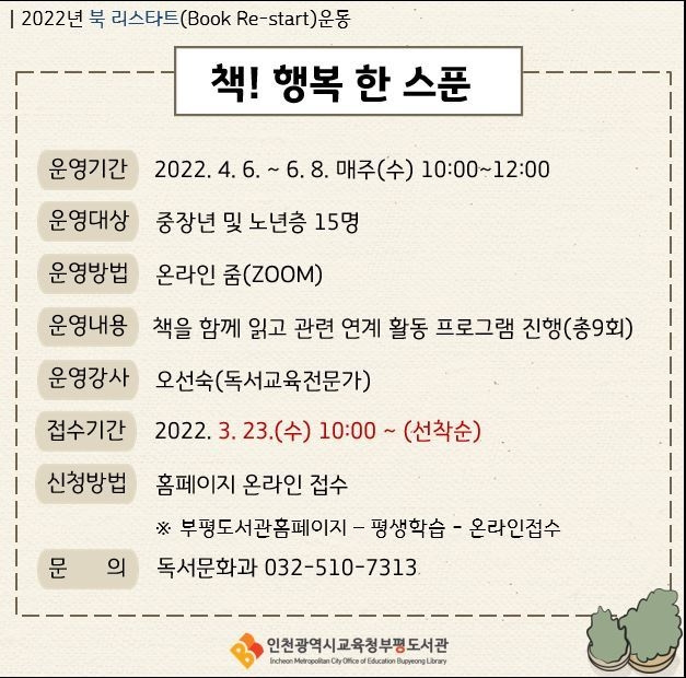 인천광역시교육청부평도서관(관장 이정기)은 북 리스타트(Book Re-start) 운동 사업으로 중장년 및 노년층 대상 맞춤형 독서프로그램 「책! 행복 한 스푼」을 운영한다고 23일 밝혔다.