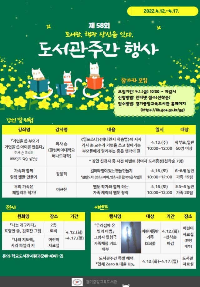 경기중앙교육도서관(관장 신창승)은 다음 달 1일부터 학생, 학부모 등 지역 주민을 대상으로 도서관 주간 독서문화 프로그램에 선착순 참여 신청을 받는다.
