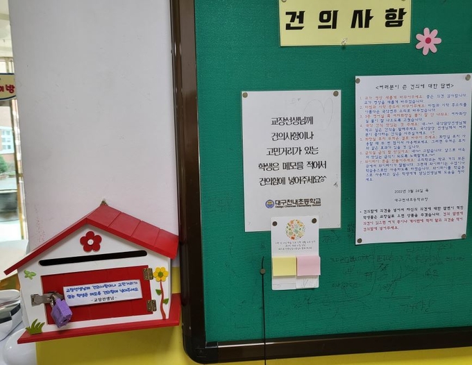 대구 천내초등학교(교장 최성식)는 2년째 ‘행복한 건의함’을 운영하고 있다. 학생들이 건의함에 어떠한 의견이든지 넣으면 바로 교장선생님이 그 건의에 대한 답변을 하고 있다. 이를 통해 천내초등학교는 학생과 교직원 모두가 나날이 행복해지는 경험을 하고 있다.