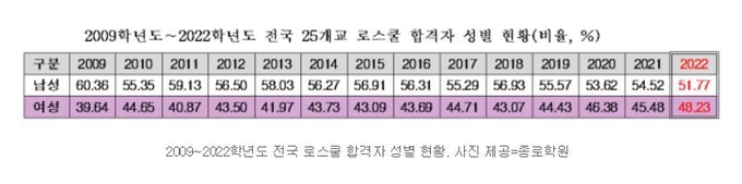 1일 종로학원에 따르면 2022학년도 로스쿨 합격자는 남성 1109명(51.77%), 여성 1033명(48.23%)으로 집계됐다. 전년 대비 남성은 2.75%포인트 감소했지만 여성은 2.75%포인트 늘었다.
