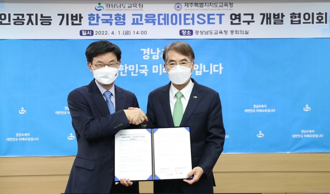 경상남도교육청(교육감 박종훈)과 제주특별자치도교육청(교육감 이석문)은 4월 1일(금) 경남교육청 중회의실에서 빅데이터·인공지능 플랫폼 아이톡톡 성과를 바탕으로 ‘인공지능 기반 한국형 교육 데이터 세트’를 구축하기 위한 업무 협약식을 열었다.