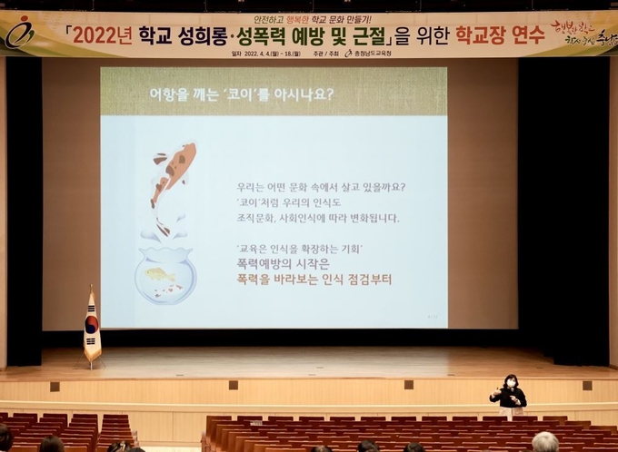 이와 관련해 교육청은 4일 충남교육청학생교육문화원(천안시 소재)에서 천안·아산시 소재 초·중·고등학교 학교장을 대상으로 성희롱ㆍ성폭력 예방 연수를 실시했다고 밝혔다.
