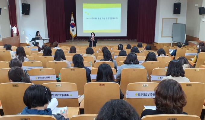 이와 관련하여 교육청은 도내 유치원 돌봄교실을 운영하는 100개원의 업무담당자와 관리자를 대상으로 4일 ‘2022학년도 유치원 돌봄교실 업무담당자 연수’를 성황리에 실시했다고 밝혔다.