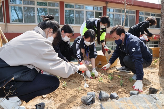 자목련, 이팝나무, 야생화 등 총 41종 1천여 본이 식재된 진천여중 학교숲은 이날 관목류 92주와 참나리 등 초본류 1,800본을 추가 식재했다.