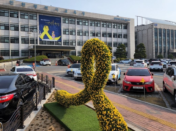 이를 위해 시교육청은 4일 본관 정면에 대형 추모 현수막과 함께 중앙 도로 양쪽에 추모의 노랑 바람개비와 추모 리본의 상징하는 대형 토피어리(꽃 조형물)를 설치하는 등 ‘세월호 참사 추모길’을 조성했다.