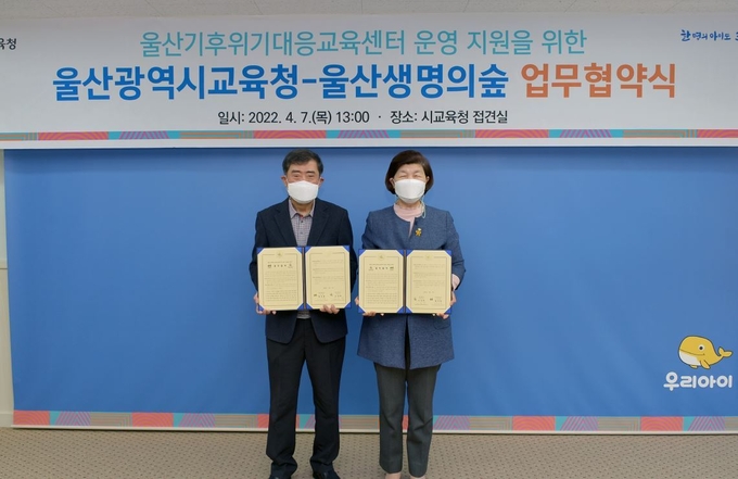 울산시교육청은 7일 교육청 접견실에서 울산생명의숲과 ‘울산기후위기대응교육센터 운영 지원을 위한 업무협약’을 체결했다.