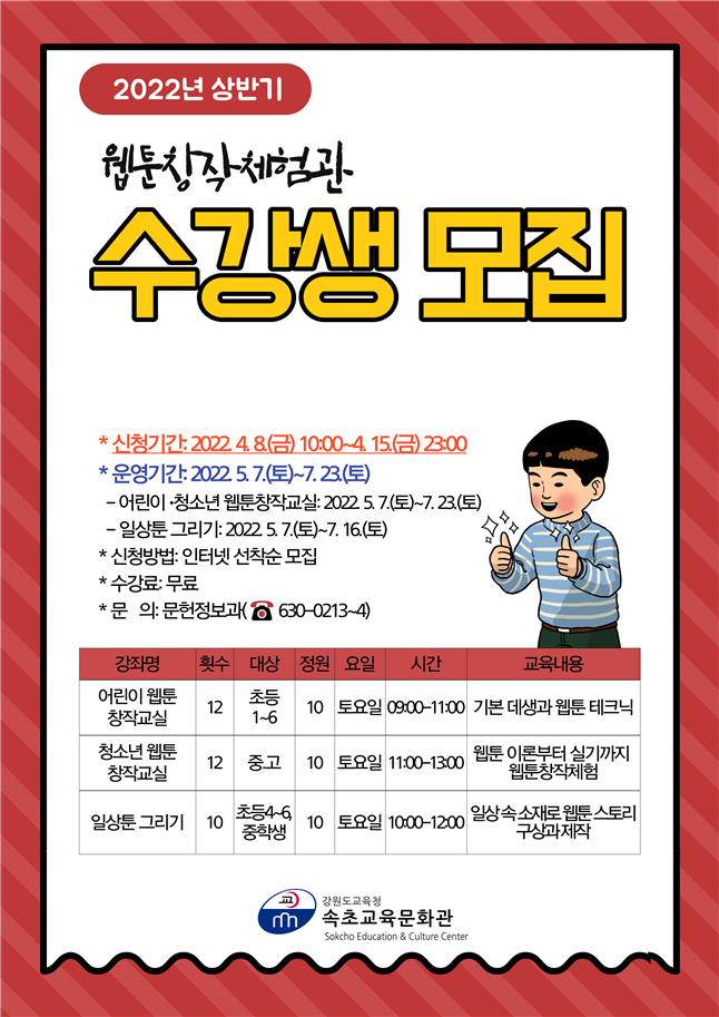 속초교육문화관 관계자는 “이번 웹툰 창작 강좌를 통해 새로운 대중문화의 핵심 콘텐츠인 웹툰에 대한 이해를 높이고, 어린이・청소년에게 진로 탐색, 만화 창작 체험의 기회가 되길 바란다.”라고 말했다.