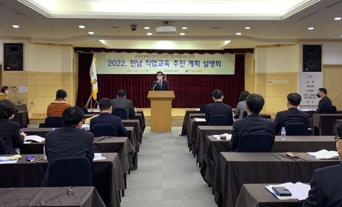전라남도교육청이 4월 7일(목) 화순금호리조트에서 도내 직업계고등학교 교장 46명을 대상으로 2022학년도 전남 직업교육 추진 사업 설명회를 개최했다.