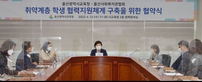 울산광역시교육청(교육감 노옥희)은 13일 시교육청 정책회의실에서 울산사회복지관협회(협회장 이현주)와 취약계층 학생 협력지원 체계 구축을 위한 업무 협약을 체결하였다.