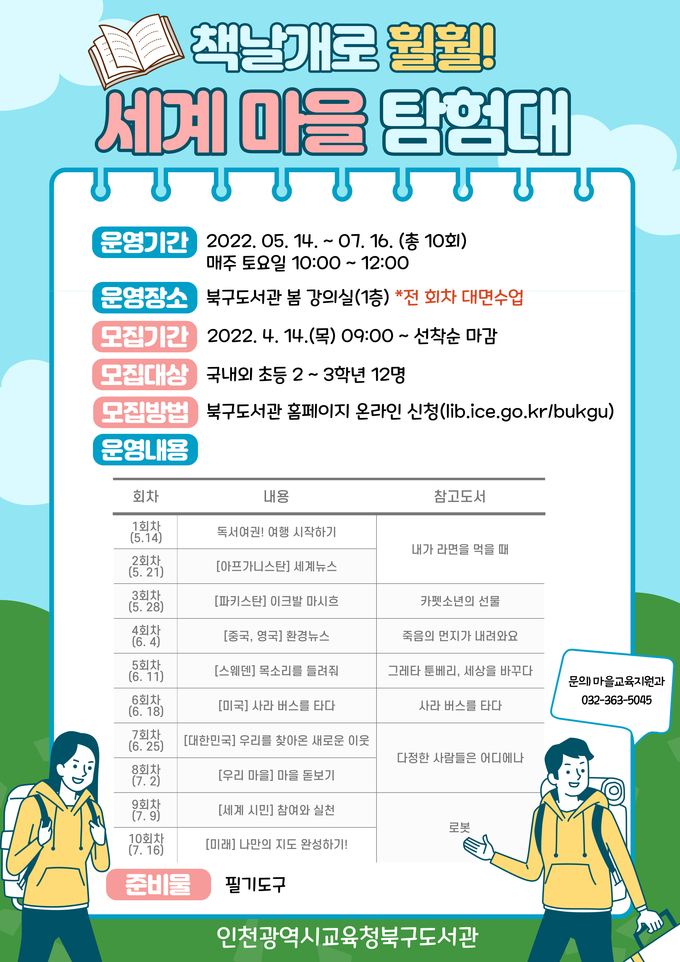 인천광역시교육청북구도서관(관장 정만교)이 문화체육관광부가 주최한 ‘2022년 도서관 다문화 서비스 지원 공모사업’에 선정돼 5월부터 ‘책날개로 훨훨! 세계마을탐험대’ 프로그램을 운영한다.