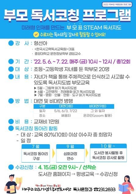 대구2‧28기념학생도서관(관장 황윤애)은 자녀들에게 책을 통해 주체적으로 사고하고 미래 사회에 필요한 통합사고력을 키울 수 있도록 학부모 독서코칭 전문가 양성을 위한‘부모 독서코칭 프로그램’을 개설하고 오는 4월 15일(금)부터 참가자를 모집한다.