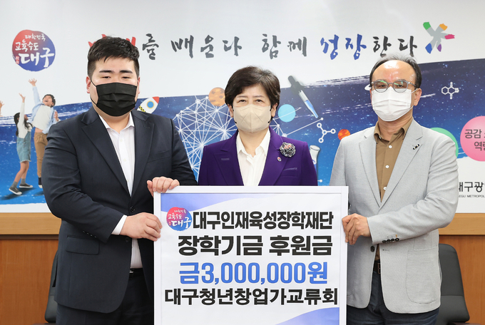 대구인재육성장학재단은 대구청년창업가교류회(회장 김경도 외 1명)에서 4월 13일(수) 오후 2시 대구시교육청을 방문해 장학금 3백만원을 기탁했다고 밝혔다.