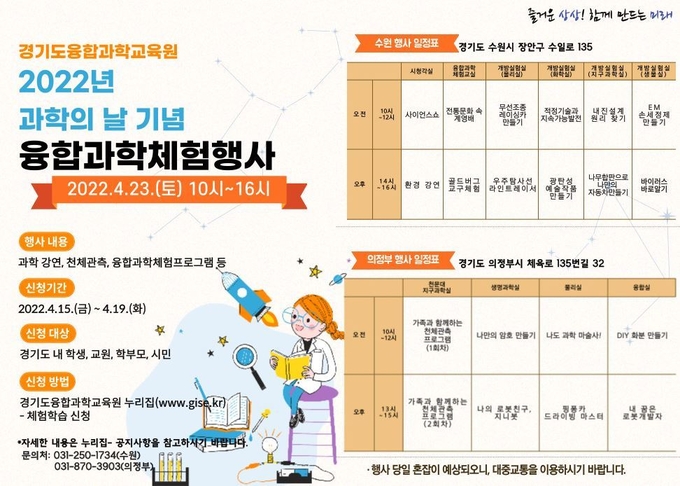 행사는 전문가 과학 강연, 천체관측, 수학·과학·정보 융합 체험 등 을 수원(경기도융합과학교육원)과 의정부(경기도융합과학교육원 북부교육관)에서 23일 진행한다.