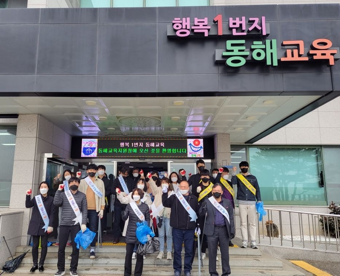 이번 행사는 청렴과 공정을 기반으로 깨끗하고 신뢰받는 동해교육 실현을 위해 직원들이 청렴 문구가 새겨진 어깨띠를 매고 청렴의지를 다지며 시내 주변 쓰레기를 줍는 거리정화 활동을 함께 진행했다.