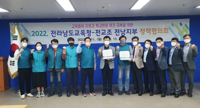 전라남도교육청(교육감 장석웅)과 전국교직원노동조합 전남지부(지부장 장관호)는 15일(금) 전라남도교육청 중회의실에서 노사 양측 관계자들이 참석한 가운데 ‘2022년 상반기 정책협의회 체결식’을 가졌다.