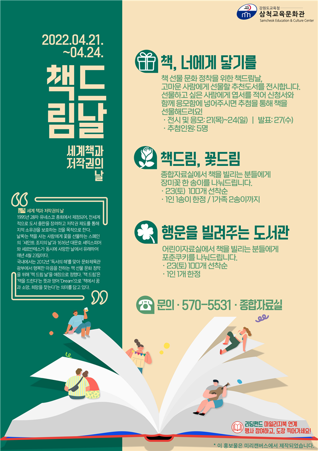 삼척교육문화관(관장 박영애)은 21일(목)부터 24일(일)까지 「책 드림 날(세계 책과 저작권의 날)」 행사를 운영한다.