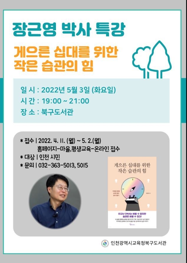 인천광역시교육청북구도서관(관장 정만교)은 5월 3일 장근영 박사(한국청소년정책연구원, 선임연구위원)의 부모교육 특강을 운영한다.