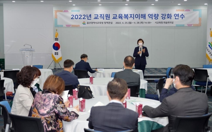 울산광역시교육청(교육감 노옥희)은 25일 시교육청 외솔회의실에서 유치원장 및 초등학교장을 대상으로 ‘2022 교직원 교육복지 역량 강화 연수’를 했다.