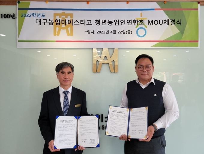 대구농업마이스터고등학교(교장 윤철수)는 4월 22일(금) 청년농업인연합회(회장 서인호)와 도시와 농촌의 상호발전을 위해 협력하고, 우수농업인 양성을 위한 상호 협력 양해각서(MOU)를 체결했다고 25일(월) 전했다.