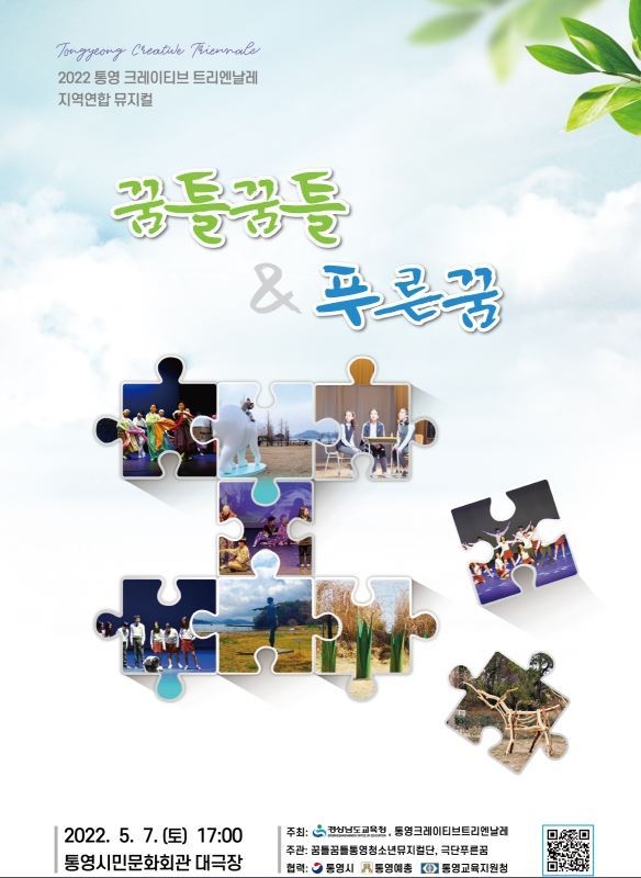 경상남도교육청은 5월 7일 오후 5시 통영시민문화회관 대극장에서 통영 크레이티브 트리엔날레 폐막 공연으로 뮤지컬 '꿈틀꿈틀 & 푸른 꿈'을 선보인다. 트리엔날레는 3년마다 열리는 국제적 미술 전람회다.