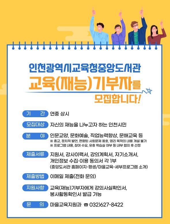 인천광역시교육청중앙도서관(관장 김용석)은 개인의 지식과 재능을 발휘해 학습을 나누고 배움의 즐거움을 알리는 교육(재능)기부자를 모집한다고 4일 밝혔다.