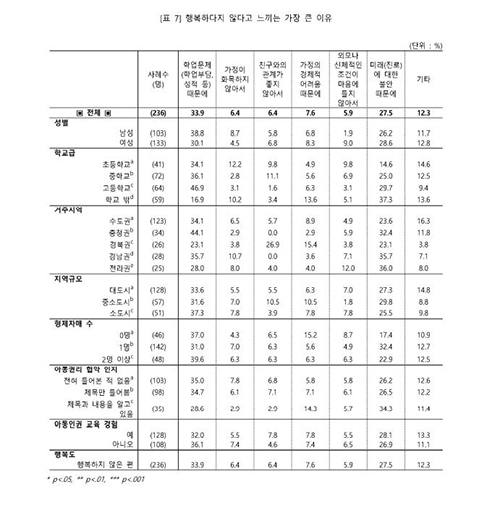 행복하지 않은 이유로는 10명 중 3명 이상이 '학업 문제'를 들었고, 이어 '미래에 대한 불안'과 '가정의 경제적 어려움' 등을 꼽았다. 반면 18.6%는 '행복하지 않다'(전혀 행복하지 않다 2.8%, 별로 행복하지 않다 15.8%)고 답했다.
