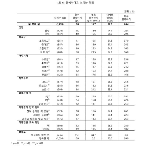 보건복지부와 아동권리보장원이 국내 아동·청소년 1,270명을 대상으로 설문조사한 결과 '행복하지 않다'는 응답이 18.6%로 나타났다.