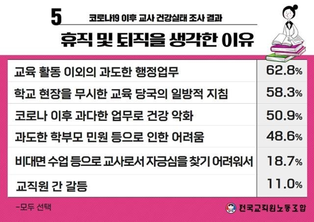 지난 2년 반 동안의 코로나19 유행기간 동안 교사들이 수업·연구·생활지도 등 교육활동이 아닌 행정업무에 사용한 시간을 조사한 문항에서는 '4시간 이상'이 34.1%, '3시간'이 25.9%로 조사됐다. 5년 차 미만 교사들에서는 '4시간 이상 행정업무를 한다'는 응답률이 43.3%로 특히 높았다. 전교조는 "하루 8시간 근무의 절반 이상을 교육 이외에 허비한다는 의미"라고 지적했다.