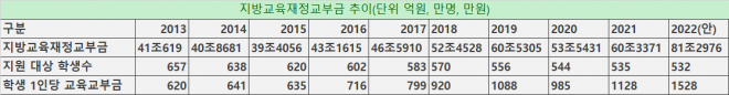 올해 교육교부금을 학생 수(532만명)로 나누면 학생 1인당 1528만원 수준이다. 지난해에는 1128만원이었다. 2013년 625만원과 비교하면 10년 사이 2.5배 늘었다.