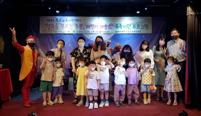 대구달성교육지원청(교육장 이두희) 특수교육지원센터는 5월 21일(토) 블루 마술극장에서 가정의 달을 맞아 관내 유·초·중학교 특수교육대상자 32가정을 대상으로 ‘행복을 부르는 주문, 패밀리 마술쇼’가족지원 프로그램을 운영했다.