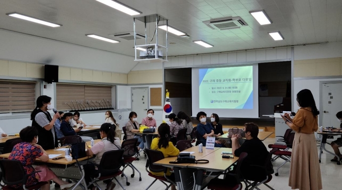 전라남도구례교육지원청(교육장 김영훈)은 3층 대회의실에서 관내 중, 고등학교 교감 선생님, 학부모 담당 선생님, 학교 학부모회 임원 등 총 24명의 구례 교육공동체가 모둠을 구성하여 학부모 학교 교육 참여 확대 및 학부모 자치 활성화를 위한 중등 교직원학부모 다모임 활성화 연찬회를 실시하였다.