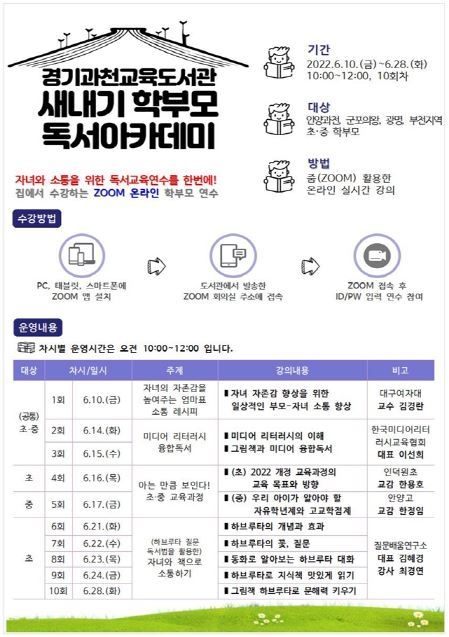 경기과천교육도서관(관장 하석종)이 10일부터 28일까지 초·중 새내기 학부모를 대상으로 ‘새내기 학부모 독서아카데미’를 온라인으로 운영한다.