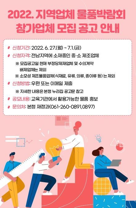 전라남도교육청이 지역경제 활성화를 위해 ‘2022. 지역업체 물품박람회’를 개최키로 하고 참가업체를 6월 27일(월)부터 7월 1일(금)까지 모집한다.