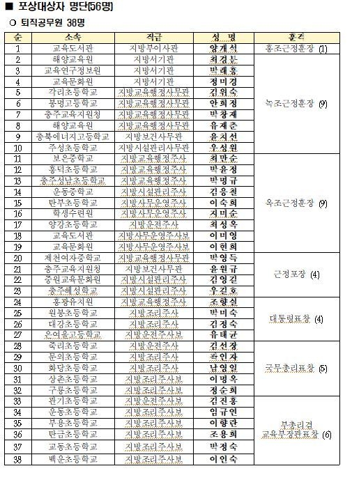 퇴직 지방공무원 38명(훈장 19명, 포장 4명, 대통령표창 4명, 국무총리표창 5명, 부총리 겸 교육부장관 표창 6명), 모범공무원 18명(교원 11명, 지방공무원 7명)이다.
