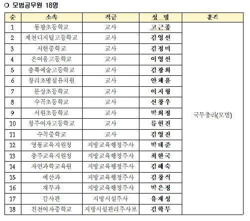 이와 함께 동광초 고근종 교사와 영동교육지원청 박태준 총무팀장 등 18명은 모범공무원 표창을 받았다.
