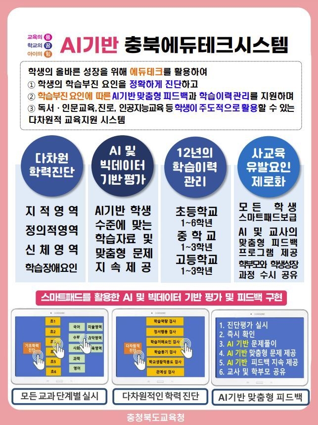 ‘충북 에듀테크 시스템’은 학생들의 기초학력 및 교과별 성취도를 AI기반으로 확인하고 맞춤형 피드백을 제공하는 프로그램이며 장기적으로 학력뿐만 아니라 독서·인문교육, 진로, 인공지능교육 등 그 영역을 넓혀갈 계획이다.