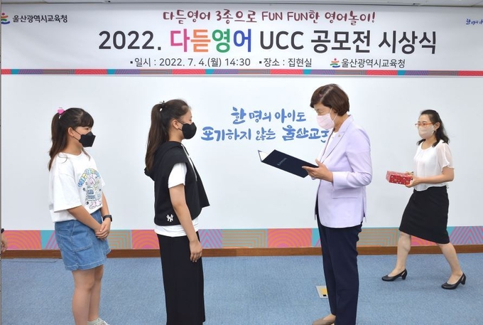 울산광역시교육청(교육감 노옥희)은 4일 다듣영어 UCC 공모전에서 입상한 초등학생 5팀과 그 가족, 지도교사를 초청하여 집현실에서 시상식을 열었다.