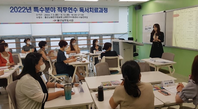울산남부도서관(관장 김현미)은 유치원․초․중․고․특수학교 교원 25명을 대상으로 7월 5일부터 9월 13일까지 매주 화요일 오후 6시, 울산교육연구정보원 교원연구지원센터에서‘2022년 특수분야 직무연수 독서치료과정’연수를 실시한다고 밝혔다.