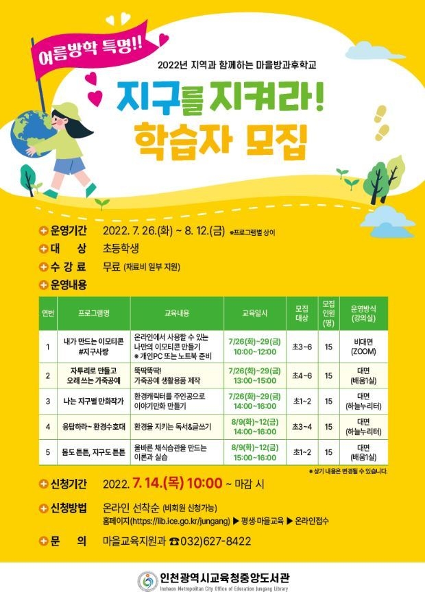 인천광역시교육청중앙도서관(관장 신명희)은 26일부터 8월 12일까지 방학을 맞아 「여름방학 특명! 지구를 지켜라!」를 주제로 특강을 운영한다.