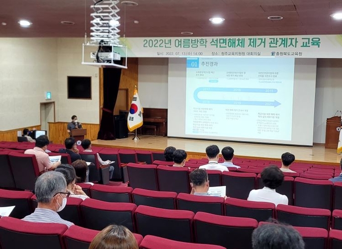 충청북도교육청은 2022년 여름방학 석면 해체·제거 관계자 교육을 청주교육지원청 대회의실에서 7월 13일(수)에 진행했다.