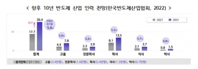 정부는 향후 10년간 반도체 산업 성장에 따른 신규 산업인력 약 12만7000명이 추가로 필요한 것으로 보고 있다. 특히 박사(6.8%)와 석사(5.7%) 학력의 인력 증가율이 높을 것으로 전망된다.