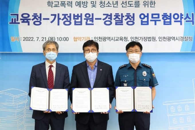 인천광역시교육청(교육감 도성훈)은 21일 학교폭력 예방 및 청소년 선도를 위한 교육청(교육감 도성훈)-가정법원(법원장 최종두)-인천경찰청(청장 이영상)과 업무협약을 체결하고, 안전에 안심을 더하는 책임교육을 위해 유관기관과 협조체제를 강화하는 학교폭력종합안전망을 구축하기로 했다.
