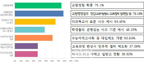 조사 결과 응답 교사 10명 중 8명이 고교학점제 전면 시행에 따른 지역 격차를 우려했다. 고교학점제는 진로·적성에 따라 선택과목을 골라 들은 뒤 학점이 쌓이면 졸업하는 제도로 2025년 전면 시행을 앞두고 있다. 학생 선택권을 보장하기 위해선 다양한 과목을 개설해야 하며, 이를 가르칠 교사·강사 확충이 불가피하다.