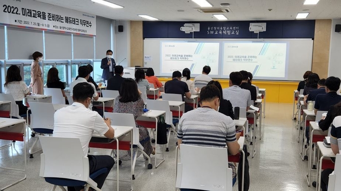 울산교육연구정보원(원장 차영기)은 7월 25일부터 8월 5일까지 유・초・중・고・특수학교 교원 및 교육전문직원 30명을 대상으로‘2022. 미래교육을 준비하는 에듀테크 직무연수’를 운영한다고 밝혔다.