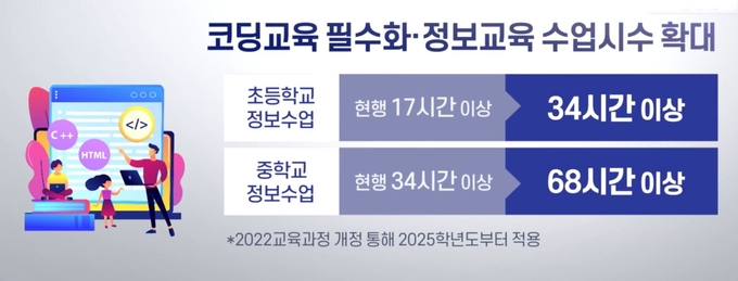2025년부터 초·중학교 정보교과 수업 시수가 2배로 늘어나고, 코딩(컴퓨터언어) 교육이 필수화된다.
