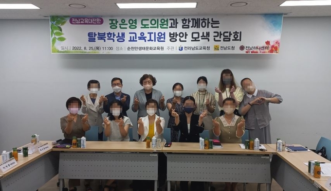 전남교육청은 25일 순천만생태문화교육원 2층 9회의실에서 장은영(더불어민주당, 비례) 전남도의원, 김진남(순천) 전남도의원, 학부모, 유관기관과 탈북학생 교육지원 방안 모색을 위한 간담회를 가졌다.