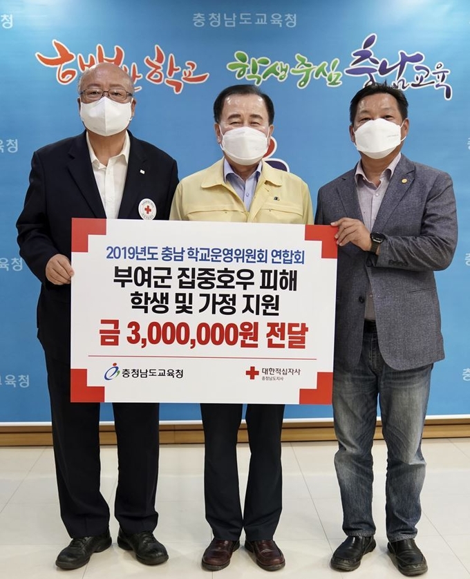 이번 성금은 2019년도 충남 학교운영위원회 연합회로 함께 활동했던 시·군 학교운영위원장 협의회 회장들이 모여 마련한 것으로, 부여지역 집중호우로 인해 수해피해를 입은 학생들을 위로하고 피해 가정을 지원하기 위하여 삼백만원을 모금했다.