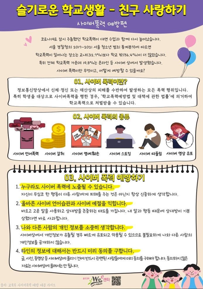 코로나19로 잠시 주춤했던 학교폭력이 전면 등교로 증가 양상을 보이고 전체 학교폭력 중 사이버 폭력의 비중이 늘어감에 따라, 구체적으로 사이버 폭력의 정의와 종류를 설명하고 예방법을 소개한다.